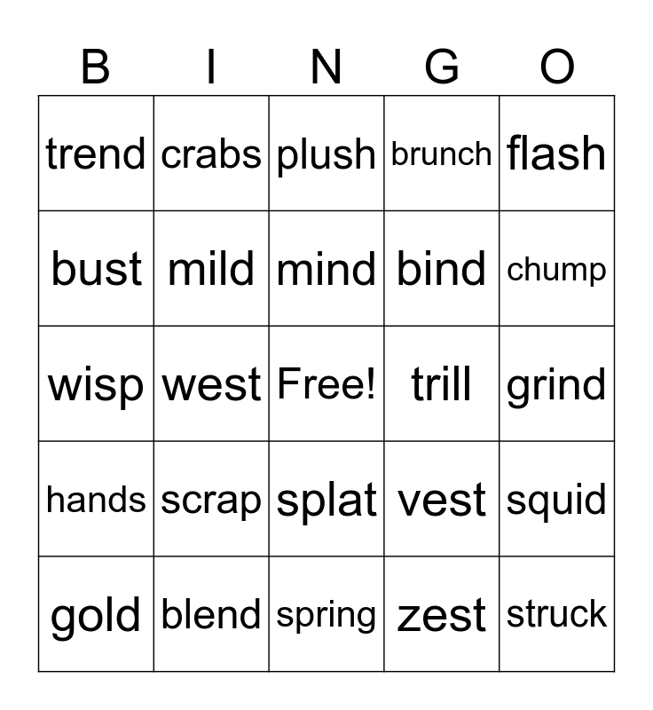 This bingo card has a free space and 24 words: scrap, blend, mind, gold, flash, trend, bust, crabs, trill, splat, bind, wisp, vest, squid, mild, zest, grind, plush, chump, west, struck, hands, brunch and spring.