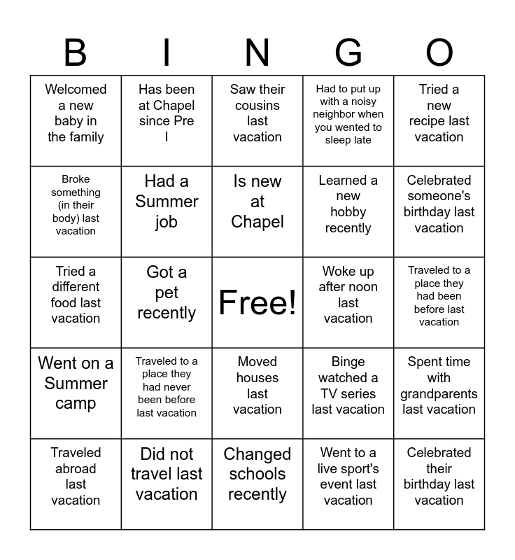 This bingo card has a free space and 24 words: Traveled to a place they had never been before last vacation, Did not travel last vacation, Is new at Chapel, Traveled abroad last vacation, Tried a new recipe last vacation, Welcomed a new baby in the family, Broke something (in their body) last vacation, Has been at Chapel since Pre I, Woke up after noon last vacation, Moved houses last vacation, Learned a new hobby recently, Tried a different food last vacation, Binge watched a TV series last vacation, Spent time with grandparents last vacation, Had a Summer job, Went to a live sport's event last vacation, Traveled to a place they had been before last vacation, Saw their cousins last vacation, Celebrated someone's birthday last vacation, Got a pet recently, Celebrated their birthday last vacation, Went on a Summer camp, Had to put up with a noisy neighbor when you wented to sleep late and Changed schools recently.