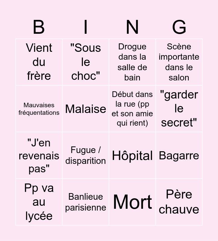 This bingo card has 16 words: Banlieue parisienne, Bagarre, Drogue dans la salle de bain, Vient du frère, "J'en revenais pas", "Sous le choc", Hôpital, Mort, Mauvaises fréquentations, Malaise, Pp va au lycée, Scène importante dans le salon, Fugue / disparition, "garder le secret", Début dans la rue (pp et son amie qui rient) and Père chauve.