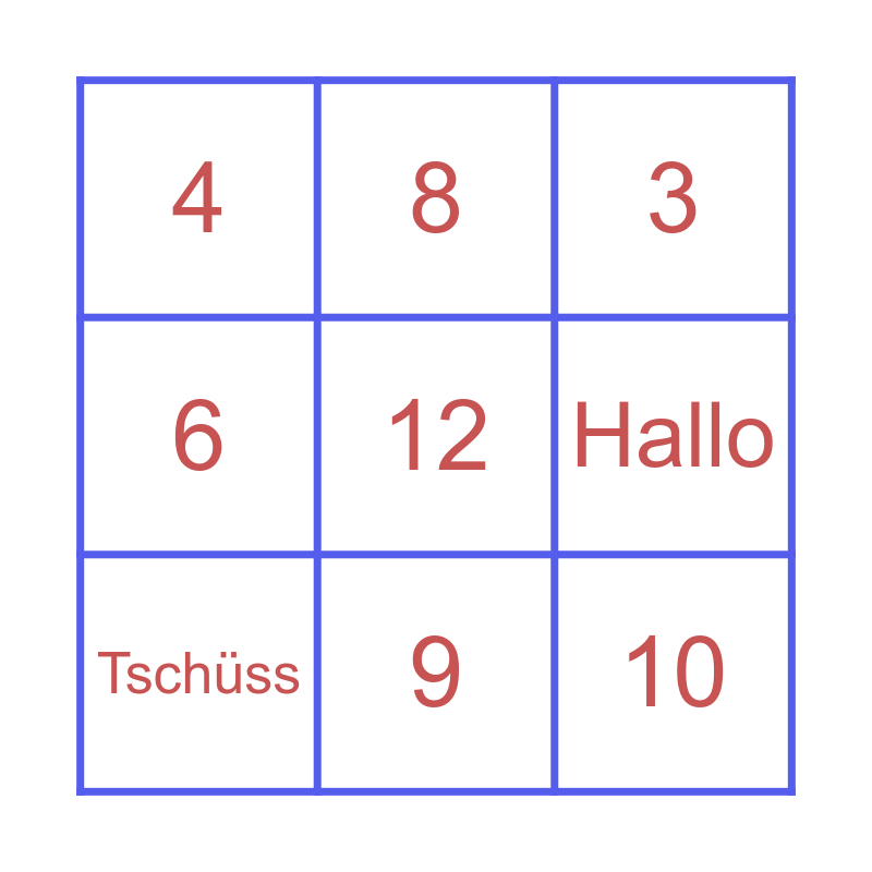 This bingo card has 18 words: 1, 2, 3, 4, 5, 6, 7, 8, 9, 10, 11, 12, Guten Morgen, Hallo, Tschüss, Guten Tag, Guten Abend and Gute Nacht.