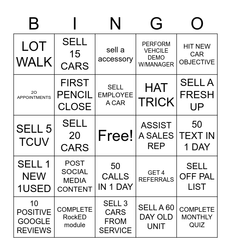 This bingo card has a free space and 24 words: POST SOCIAL MEDIA CONTENT, COMPLETE RockED module, SELL EMPLOYEE A CAR, 10 POSITIVE GOOGLE REVIEWS, HIT NEW CAR OBJECTIVE, LOT WALK, 2O APPOINTMENTS, SELL 15 CARS, ASSIST A SALES REP, 50 CALLS IN 1 DAY, HAT TRICK, SELL 5 TCUV, GET 4 REFERRALS, SELL OFF PAL LIST, FIRST PENCIL CLOSE, SELL A 60 DAY OLD UNIT, 50 TEXT IN 1 DAY, sell a accessory, SELL A FRESH UP, SELL 20 CARS, COMPLETE MONTHLY QUIZ, SELL 1 NEW 1USED, PERFORM VEHCILE DEMO W/MANAGER and SELL 3 CARS FROM SERVICE.