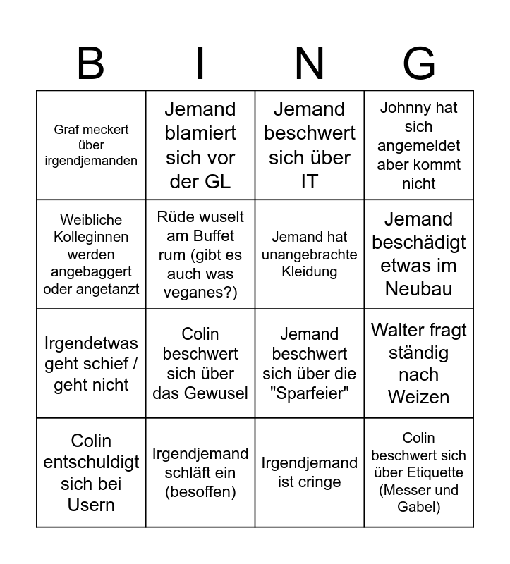 This bingo card has 16 words: Colin entschuldigt sich bei Usern, Irgendjemand schläft ein (besoffen), Jemand beschwert sich über IT, Johnny hat sich angemeldet aber kommt nicht, Weibliche Kolleginnen werden angebaggert oder angetanzt, Jemand blamiert sich vor der GL, Jemand beschwert sich über die "Sparfeier", Walter fragt ständig nach Weizen, Graf meckert über irgendjemanden, Rüde wuselt am Buffet rum (gibt es auch was veganes?), Irgendjemand ist cringe, Jemand beschädigt etwas im Neubau, Irgendetwas geht schief / geht nicht, Colin beschwert sich über das Gewusel, Jemand hat unangebrachte Kleidung and Colin beschwert sich über Etiquette (Messer und Gabel).