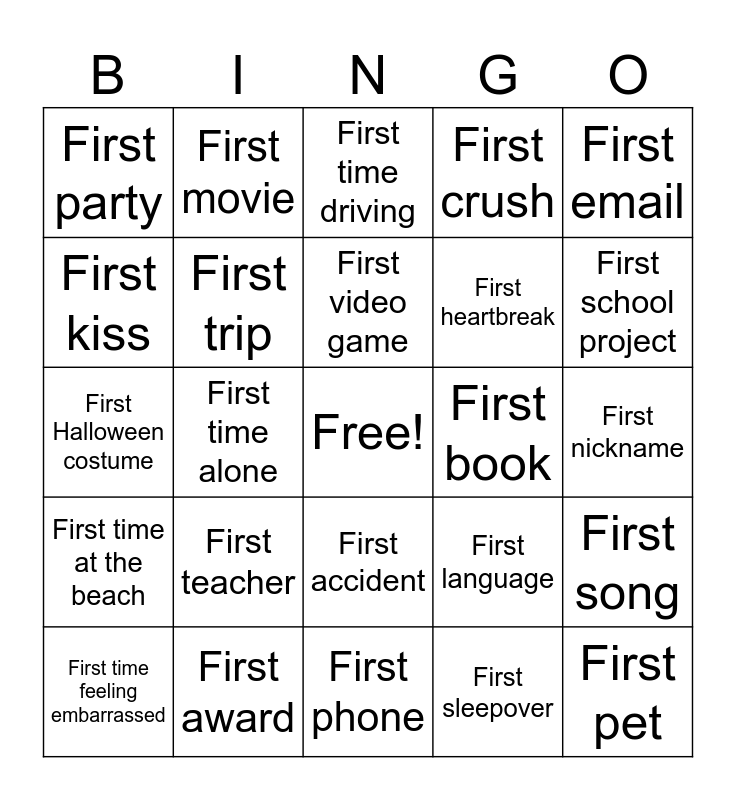 This bingo card has a free space and 50 words: First day of school, First pet, First friend, First phone, First teacher, First fear, First movie, First concert, First kiss, First job, First trip, First crush, First song, First language, First toy, First bike, First video game, First book, First computer, First email, First time alone, First sleepover, First party, First heartbreak, First paycheck, First cooking experience, First school project, First time swimming, First time driving, First accident, First time crying at school, First birthday you remember, First time on stage, First celebrity crush, First award, First selfie, First online class, First favorite food, First scary movie, First nickname, First fight, First time traveling by plane, First tattoo (or imagined one), First sleep in a tent, First time feeling embarrassed, First Halloween costume, First favorite cartoon, First time riding a horse, First time at the beach and First school uniform.