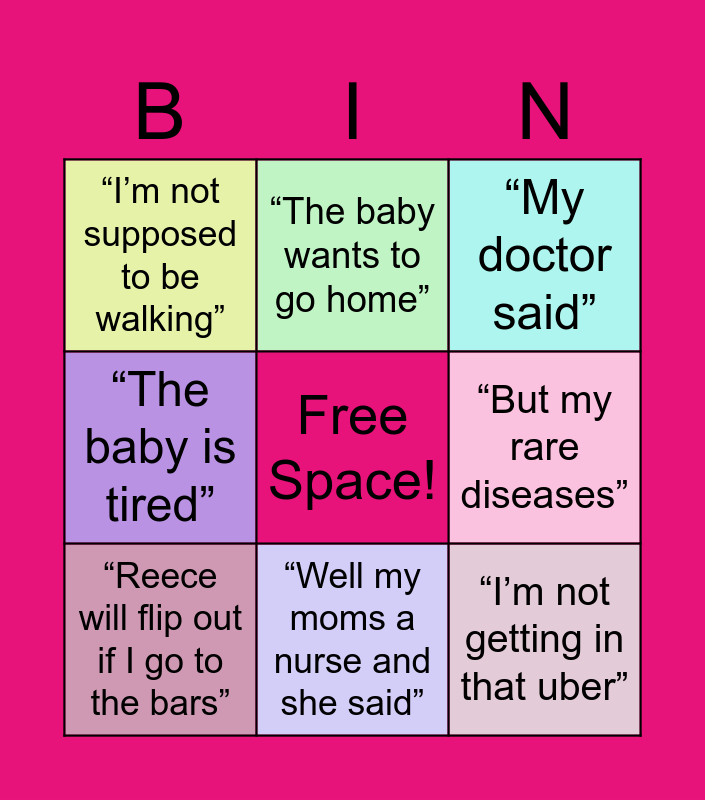 This bingo card has a free space and 8 words: “But my rare diseases”, “My doctor said”, “The baby wants to go home”, “Reece will flip out if I go to the bars”, “I’m not supposed to be walking”, “I’m not getting in that uber”, “The baby is tired” and “Well my moms a nurse and she said”.