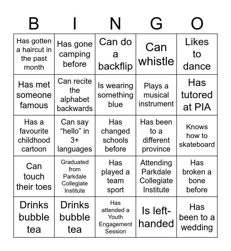 This bingo card has a free space and 24 words: Graduated from Parkdale Collegiate Institute, Drinks bubble tea, Is wearing something blue, Drinks bubble tea, Likes to dance, Has gotten a haircut in the past month, Has met someone famous, Has gone camping before, Has been to a different province, Has played a team sport, Plays a musical instrument, Has a favourite childhood cartoon, Attending Parkdale Collegiate Institute, Has broken a bone before, Can recite the alphabet backwards, Is left-handed, Knows how to skateboard, Can do a backflip, Has tutored at PIA, Can say “hello” in 3+ languages, Has been to a wedding, Can touch their toes, Can whistle and Has attended a Youth Engagement Session.