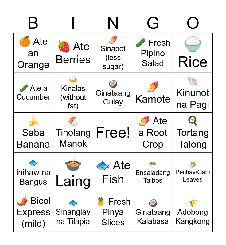 This bingo card has a free space and 24 words: π² Laing, π Sinanglay na Tilapia, π₯₯ Ginataang Gulay, πΆοΈ Bicol Express (mild), π Rice, π Ate an Orange, π₯ Ate a Cucumber, π Ate Berries, π Ate a Root Crop, π Ate Fish, π Kamote, π Saba Banana, π₯ Ensaladang Talbos, π₯¬ Pechay/Gabi Leaves, π Kinalas (without fat), π₯₯ Ginataang Kalabasa, π³ Tortang Talong, π Sinapot (less sugar), π Kinunot na Pagi, π Tinolang Manok, πΎ Adobong Kangkong, π Inihaw na Bangus, π₯ Fresh Pipino Salad and π Fresh Pinya Slices.