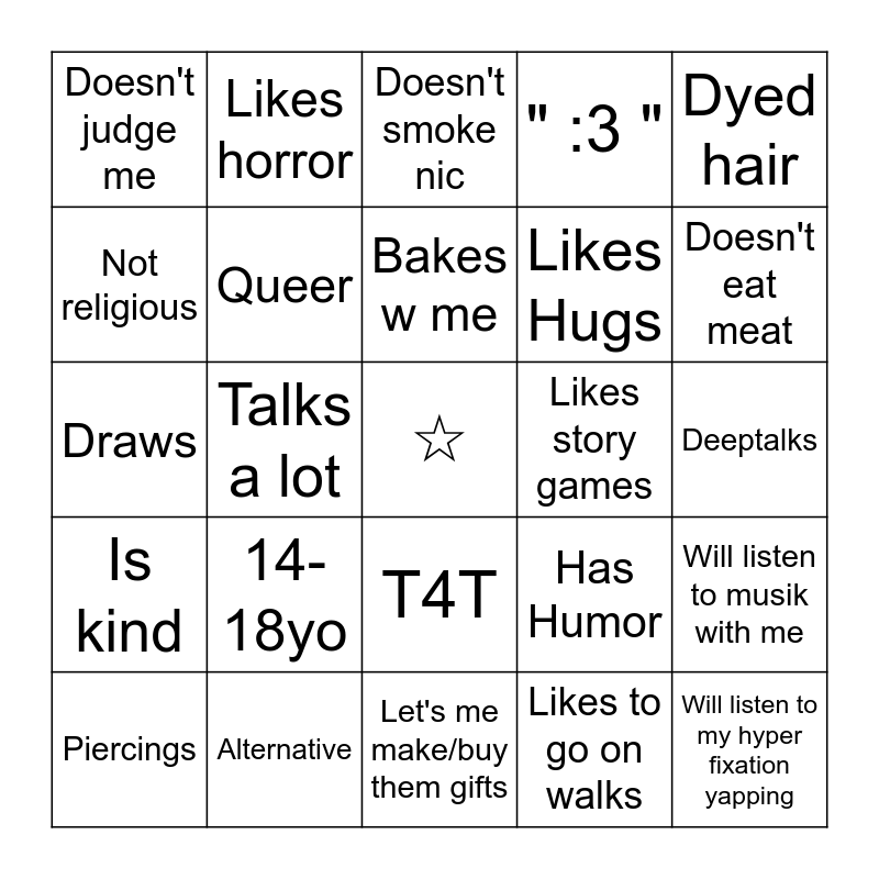 This bingo card has a free space and 24 words: 14-18yo, Alternative, Bakes w me, Piercings, Dyed hair, Doesn't judge me, Not religious, Likes horror, Likes story games, T4T, Likes Hugs, Draws, Has Humor, Will listen to musik with me, Queer, Likes to go on walks, Deeptalks, Doesn't smoke nic, Doesn't eat meat, Talks a lot, Will listen to my hyper fixation yapping, Is kind, " :3 " and Let's me make/buy them gifts.