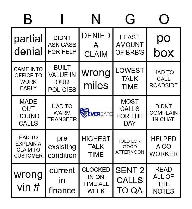 This bingo card has a free space and 24 words: pre exsisting condition, current in finance, wrong miles, wrong vin #, po box, partial denial, CAME INTO OFFICE TO WORK EARLY, DIDNT ASK CASS FOR HELP, MOST CALLS FOR THE DAY, HIGHEST TALK TIME, LOWEST TALK TIME, MADE OUT BOUND CALLS, TOLD LORI GOOD AFTERNOON, HELPED A CO WORKER, BUILT VALUE IN OUR POLICIES, SENT 2 CALLS TO QA, DIDNT COMPLAIN IN CHAT, DENIED A CLAIM, HAD TO CALL ROADSIDE, HAD TO WARM TRANSFER, READ ALL OF THE NOTES, HAD TO EXPLAIN A CLAIM TO CUSTOMER, LEAST AMOUNT OF BRB'S and CLOCKED IN ON TIME ALL WEEK.