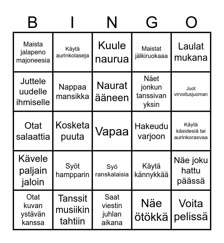 This bingo card has a free space and 24 words: Syöt hampparin, Tanssit musiikin tahtiin, Naurat ääneen, Otat kuvan ystävän kanssa, Laulat mukana, Maista jalapeno majoneesia, Juttele uudelle ihmiselle, Käytä aurinkolaseja, Hakeudu varjoon, Syö ranskalaisia, Näet jonkun tanssivan yksin, Otat salaattia, Käytä kännykkää, Näe joku hattu päässä, Nappaa mansikka, Näe ötökkä, Käytä käsidesiä tai aurinkorasvaa, Kuule naurua, Juot virvoitusjuoman, Kosketa puuta, Voita pelissä, Kävele paljain jaloin, Maistat jälkiruokaaa and Saat viestin juhlan aikana.