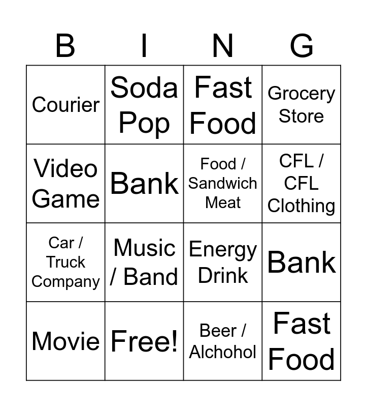 This bingo card has 16 words: Free!, Bank, Fast Food, Courier, Car / Truck Company, Soda Pop, Energy Drink, Beer / Alchohol, Video Game, Bank, Movie, Grocery Store, Music / Band, CFL / CFL Clothing, Food / Sandwich Meat and Fast Food.