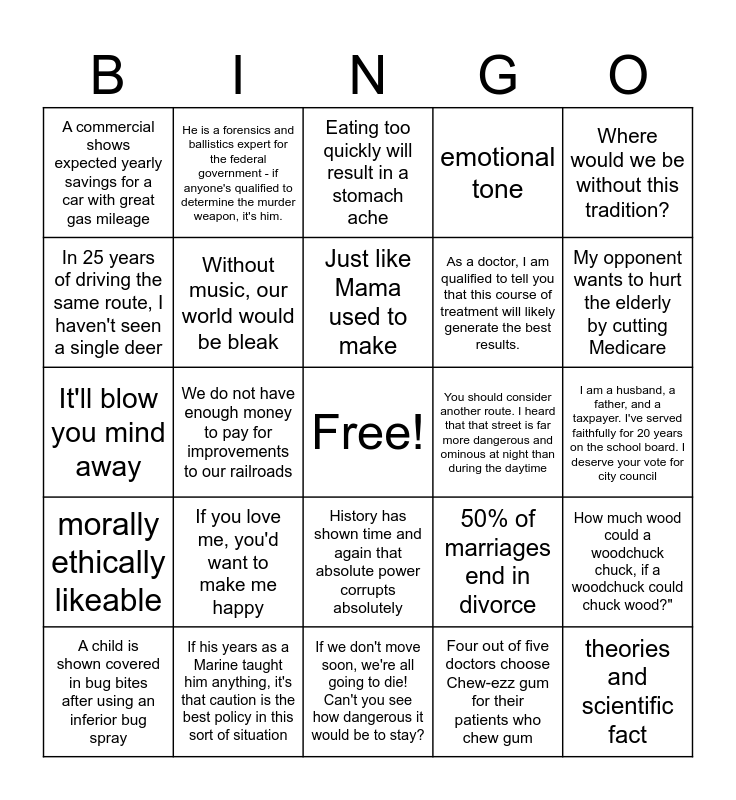 This bingo card has a free space and 24 words: If you love me, you'd want to make me happy, If his years as a Marine taught him anything, it's that caution is the best policy in this sort of situation, Just like Mama used to make, A child is shown covered in bug bites after using an inferior bug spray, Where would we be without this tradition?, A commercial shows expected yearly savings for a car with great gas mileage, In 25 years of driving the same route, I haven't seen a single deer, He is a forensics and ballistics expert for the federal government - if anyone's qualified to determine the murder weapon, it's him., You should consider another route. I heard that that street is far more dangerous and ominous at night than during the daytime, History has shown time and again that absolute power corrupts absolutely, As a doctor, I am qualified to tell you that this course of treatment will likely generate the best results., It'll blow you mind away, 50% of marriages end in divorce, How much wood could a woodchuck chuck, if a woodchuck could chuck wood?", Without music, our world would be bleak, Four out of five doctors choose Chew-ezz gum for their patients who chew gum, I am a husband, a father, and a taxpayer. I've served faithfully for 20 years on the school board. I deserve your vote for city council, Eating too quickly will result in a stomach ache, My opponent wants to hurt the elderly by cutting Medicare, We do not have enough money to pay for improvements to our railroads, theories and scientific fact, morally ethically likeable, emotional tone and If we don't move soon, we're all going to die! Can't you see how dangerous it would be to stay?.