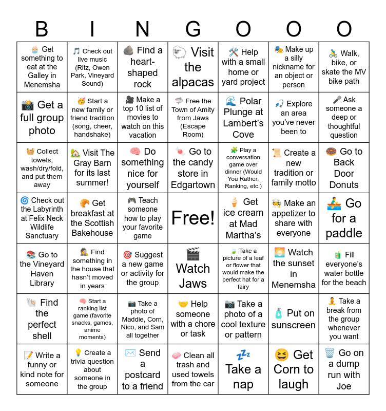 This bingo card has a free space and 76 words: ๐ Take Tony for a walk on the beach, ๐ Find the perfect shell, ๐ชจ Find a heart-shaped rock, ๐ท Take a photo of a cool texture or pattern, ๐งบ Go on a picnic, ๐ฆ Use the Merlin app to find and ID a new bird, ๐ Watch the sunset in Menemsha, ๐ชจ Find A Rock, B Rock, THE Rock, ๐ Take a picture of a leaf or flower that would make the perfect hat for a fairy, ๐ผ Go to the top of the lighthouse in Aquinnah, ๐๏ธ Go on a dump run with Joe, ๐งฉ Work on the puzzle, ๐ธ Get a full group photo, ๐ญ Make up a silly nickname for an object or person, ๐ท Take a vacation video, ๐ Polar Plunge at Lambertโs Cove, ๐ฃโโ๏ธ Go for a paddle, ๐ฃ Explore an area you've never been to, ๐งฝ Wash 3 loads of dishes, ๐ ๏ธ Help with a small home or yard project, ๐ฌ Watch Jaws, ๐ฆ Free the Town of Amity from Jaws (Escape Room), ๐ดโโ๏ธ Walk, bike, or skate the MV bike path, ๐ต Check out live music (Ritz, Owen Park, Vineyard Sound), ๐ Visit the alpacas, ๐งผ Clean all trash and used towels from the car, ๐ Write a funny or kind note for someone, โ๏ธ Send a postcard to a friend, ๐ฒ Play cards with Joe, ๐ง Add a song to the MV 2025 playlist, ๐ฏ Suggest a new game or activity for the group, ๐คซ Perform a stealth kindness (help quietly, surprise someone), ๐ฌ Ask people about their favorite vacation memories, ๐งฉ Play a conversation game over dinner (Would You Rather, Ranking, etc.), ๐ฅ Make a top 10 list of movies to watch on this vacation, ๐ฅณ Start a new family or friend tradition (song, cheer, handshake), ๐ Start a grocery list and ask everyone what they want added, ๐งน Sweep the dining room (at least twice), ๐งบ Collect towels, wash/dry/fold, and put them away, ๐ฎ Teach someone how to play your favorite game, ๐ค Help someone with a chore or task, ๐ท Take a photo of Maddie, Corn, Nico, and Sam all together, ๐ Get Corn to laugh, ๐จ Do an art or craft, ๐ Add something to the list of things to do, ๐ฆ Get ice cream at Mad Marthaโs, ๐ฉ Go to Back Door Donuts, ๐ง Get something to eat at the Galley in Menemsha, ๐ Buy a new board game to play together, ๐ฝ๏ธ Make a new Ninja Creami recipe, ๐งโ๐ณ Make an appetizer to share with everyone, ๐ฌ Go to the candy store in Edgartown, ๐งโ๐ณ Make a favorite snack or meal with Barat or Joe, ๐ง Fill everyoneโs water bottle for the beach, ๐ค Take a nap, ๐ฌ๏ธ Take an outdoor yoga class, ๐ Go to the Vineyard Haven Library, ๐งด Put on sunscreen, ๐ฟ Take a shower in the outdoor shower, ๐ง Take a break from the group whenever you want, ๐ง Do something nice for yourself, ๐งญ Explore a new solo walk or quiet time, ๐ง Sit with something cold (drink, popsicle, frozen towel), ๐ Complete Whereโs Waldo, ๐ญ Invent a "What If..." question for everyone to answer, ๐ง Start a ranking list game (favorite snacks, games, anime moments), ๐ค Ask someone a deep or thoughtful question, ๐ต๏ธ Find something in the house that hasnโt moved in years, ๐งธ Find a treasure at Chicken Alley, ๐ก Create a trivia question about someone in the group, ๐ Create a new tradition or family motto, ๐ก Visit The Gray Barn for its last summer!, ๐ Check out the Labyrinth at Felix Neck Wildlife Sanctuary, ๐ง Eat La Chosa burritos, ๐ฅ Get breakfast at the Scottish Bakehouse and โ Go to Mocha Mottโs.