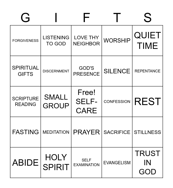 This bingo card has a free space and 34 words: OBEDIENCE, EVANGELISM, JOURNALING, REFLECTION, FASTING, DISCERNMENT, QUIET TIME, ABIDE, LISTENING TO GOD, GRATITUDE, GOD'S PRESENCE, LOVE THY NEIGHBOR, SACRED TIME, FAITHFULNESS, CONFESSION, REPENTANCE, HOLY SPIRIT, SCRIPTURE READING, MEDITATION, SACRIFICE, PRAYER, SANCTUARY, FORGIVENESS, REST, SELF EXAMINATION, TRUST IN GOD, WORSHIP, SERVICE, SILENCE, SPIRITUAL GIFTS, SURRENDER, SMALL GROUP, STILLNESS and SPIRITUAL CHECK-IN.
