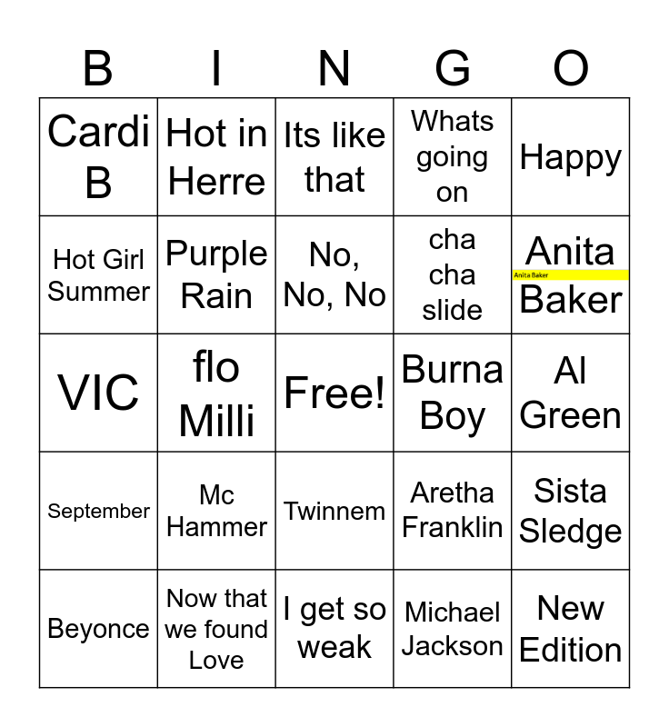 This bingo card has 1 images, a free space and 24 words: Mc Hammer, Now that we found Love, No, No, No, Beyonce, Happy, Cardi B, Hot Girl Summer, Hot in Herre, Burna Boy, Twinnem, cha cha slide, VIC, Aretha Franklin, Sista Sledge, Purple Rain, Michael Jackson, Al Green, Its like that, Anita Baker, flo Milli, New Edition, September, Whats going on and I get so weak.