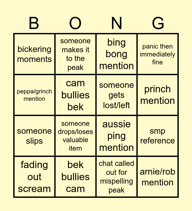 This bingo card has 24 words: snort duo mention, gay moments, princh mention, staring through window ref, peppa/grinch mention, bickering moments, cam bullies bek, someone makes it to the peak, bek bullies cam, someone dies, someone slips, aussie ping mention, ping killed by peak, scoutmaster moment, someone gets lost/left, someone gets poisoned, chat called out for mispelling peak, bing bong mention, someone drops/loses valuable item, smp reference, fading out scream, arnie/rob mention, panic then immediately fine and dnd mention.
