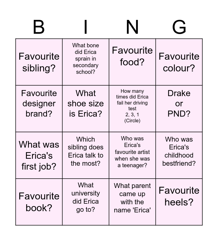 This bingo card has 16 words: What university did Erica go to?, Who was Erica's childhood bestfriend?, Favourite food?, Favourite sibling?, What was Erica's first job?, What bone did Erica sprain in secondary school?, Who was Erica's favourite artist when she was a teenager?, What parent came up with the name 'Erica', Favourite designer brand?, What shoe size is Erica?, Favourite book?, Favourite colour?, Which sibling does Erica talk to the most?, Drake or PND?, How many times did Erica fail her driving test 2, 3, 1 (Circle) and Favourite heels?.