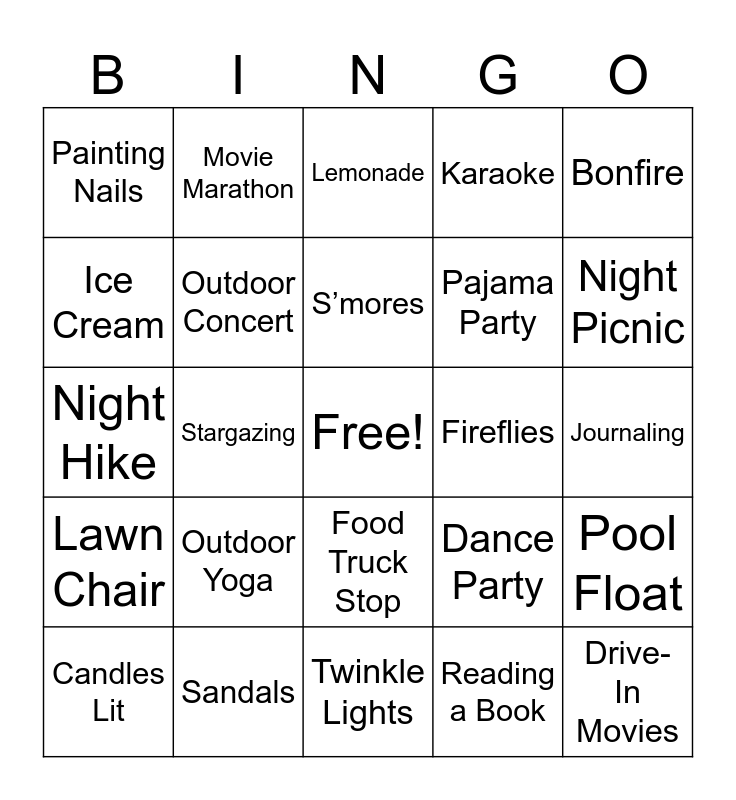 This bingo card has a free space and 75 words: Margarita, Mocktail, Lemonade, Slushie, Iced Tea, Root Beer Float, Snow Cone, Cold Brew, Fruit Punch, Milkshake, Smoothie, Sangria, S’mores, Ice Cream, Popsicles, Stargazing, Fireworks, Drive-In Movies, Glow Stick Dance, Bonfire, Sunset Walk, Night Hike, Outdoor Concert, Movie Marathon, Karaoke, Trivia Night, DIY Craft Night, Board Games, Backyard Camping, Late-Night Baking, Game Night, Talent Show, Painting Party, Dance Party, Night Picnic, Pajama Party, Sleepover, Face Masks, Journaling, Reading a Book, Watching Sitcoms, Sharing Snacks, Blanket Fort, Spa Night, Coloring, Puzzle Time, Candles Lit, Painting Nails, Tea Time, Playlist Building, Night Market, Food Truck Stop, Patio Dining, Mini Golf, Bowling Night, Ice Cream Truck, Street Fair, Farmers Market, Evening Walk, City Lights, Outdoor Yoga, Scavenger Hunt, Outdoor Movie, Amusement Park, Sunset Photo, Fireflies, Glow Sticks, Summer Breeze, Sundress, Pool Float, Lawn Chair, Sandals, Sunset Colors, Twinkle Lights and Starry Sky.