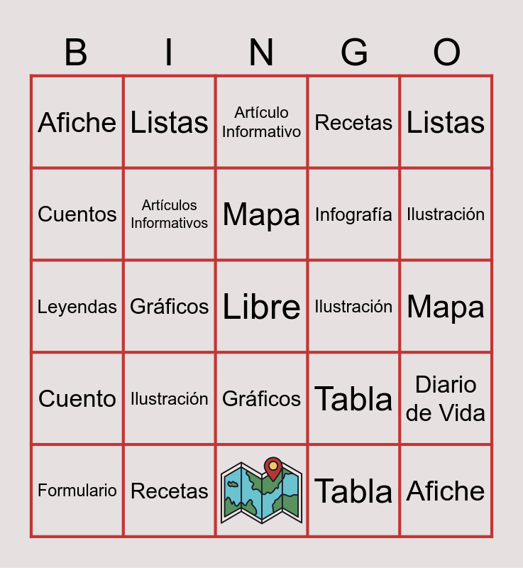 This bingo card has 1 images, a free space and 48 words: Tabla, Afiche, Infografía, Ilustración, Formulario, Listas, Gráficos, Cuentos, Leyendas, Artículos Informativos, Recetas, Diario de Vida, Tabla, Afiche, Infografía, Mapa, Ilustración, Formulario, Listas, Gráficos, Tabla, Afiche, Infografía, Mapa, Ilustración, Formulario, Listas, Gráficos, Cuento, Leyenda, Fábula, Diario de Vida, Artículo Informativo, Recetas, Tabla, Afiche, Infografía, Mapa, Ilustración, Formulario, Listas, Gráficos, Cuentos, Leyendas, Artículo Informativo, Diario de Vida, Fábulas and Recetas.