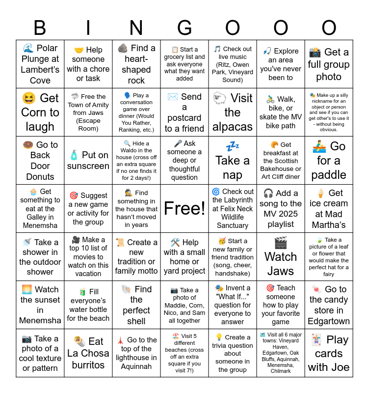 This bingo card has a free space and 82 words: π Take Tony for a walk on the beach, π Find the perfect shell, πͺ¨ Find a heart-shaped rock, π· Take a photo of a cool texture or pattern, π§Ί Go on a picnic, π¦ Use the Merlin app to find and ID a new bird, π Watch the sunset in Menemsha, πͺ¨ Find A Rock, B Rock, THE Rock, π Take a picture of a leaf or flower that would make the perfect hat for a fairy, πΌ Go to the top of the lighthouse in Aquinnah, ποΈ Go on a dump run with Joe, π§© Work on the puzzle, πΈ Get a full group photo, π Make up a silly nickname for an object or person and see if you can get other's to use it - without being obvious., π· Take a vacation video, π Polar Plunge at Lambertβs Cove, π£ββοΈ Go for a paddle, π£ Explore an area you've never been to, π§½ Wash 3 loads of dishes, π οΈ Help with a small home or yard project, π¬ Watch Jaws, π¦ Free the Town of Amity from Jaws (Escape Room), π΄ββοΈ Walk, bike, or skate the MV bike path, π΅ Check out live music (Ritz, Owen Park, Vineyard Sound), π Visit the alpacas, π§Ό Clean all trash and used towels from the car, ποΈ Visit 5 different beaches (cross off an extra square if you visit 7!), πΊοΈ Visit all 6 major towns: Vineyard Haven, Edgartown, Oak Bluffs, Aquinnah, Menemsha, Chilmark, π Jump off 2nd Bridge, π‘ Take pictures at 3 lighthouses, π Hide a Waldo in the house (cross off an extra square if no one finds it for 2 days!), π Write a funny or kind note for someone, βοΈ Send a postcard to a friend, π Play cards with Joe, π§ Add a song to the MV 2025 playlist, π― Suggest a new game or activity for the group, π€« Perform a stealth kindness (help quietly, surprise someone), π¬ Ask people about their favorite vacation memories, π£οΈ Play a conversation game over dinner (Would You Rather, Ranking, etc.), π₯ Make a top 10 list of movies to watch on this vacation, π₯³ Start a new family or friend tradition (song, cheer, handshake), π Start a grocery list and ask everyone what they want added, π§Ή Sweep the dining room (at least twice), π§Ί Collect towels, wash/dry/fold, and put them away, π― Teach someone how to play your favorite game, π€ Help someone with a chore or task, π· Take a photo of Maddie, Corn, Nico, and Sam all together, π Get Corn to laugh, π¨ Do some arts & crafts, π Add something to the list of favorite things to do on the vineyard. What are the top 10?, π¦ Get ice cream at Mad Marthaβs, π© Go to Back Door Donuts, π§ Get something to eat at the Galley in Menemsha, π² Buy a new board game to play together, π½οΈ Make a new Ninja Creami recipe, π§βπ³ Make an appetizer to share with everyone, π¬ Go to the candy store in Edgartown, π§βπ³ Make a favorite snack or meal with Barat or Joe, π§ Fill everyoneβs water bottle for the beach, π€ Take a nap, π¬οΈ Take an outdoor yoga class, π Go to the Vineyard Haven Library, π§΄ Put on sunscreen, πΏ Take a shower in the outdoor shower, π§ Take a break from the group whenever you want, πͺ· Do something nice for yourself, π§ Explore a new solo walk or quiet time, π§ Take a break with something cold (drink, popsicle, frozen towel), π Complete Whereβs Waldo, π Read a book outside (at the beach, in a park, in the yard), π Invent a "What If..." question for everyone to answer, π§ Start a ranking list game (favorite snacks, games, anime moments), π€ Ask someone a deep or thoughtful question, π΅οΈ Find something in the house that hasnβt moved in years, π Find a treasure at Chicken Alley, π‘ Create a trivia question about someone in the group, π Create a new tradition or family motto, π‘ Visit The Gray Barn for its last summer!, π Check out the Labyrinth at Felix Neck Wildlife Sanctuary, π― Eat La Chosa burritos, π₯ Get breakfast at the Scottish Bakehouse or Art Cliff diner and β Go to Mocha Mottβs and get a sticker, update it's look..