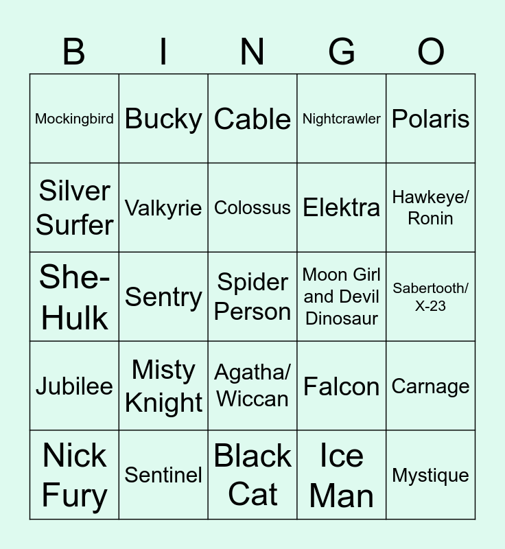 This bingo card has a free space and 24 words: Misty Knight, Sentinel, Colossus, Nick Fury, Polaris, Mockingbird, Silver Surfer, Bucky, Moon Girl and Devil Dinosaur, Agatha/ Wiccan, Elektra, She-Hulk, Falcon, Carnage, Valkyrie, Ice Man, Sabertooth/ X-23, Cable, Hawkeye/ Ronin, Sentry, Mystique, Jubilee, Nightcrawler and Black Cat.