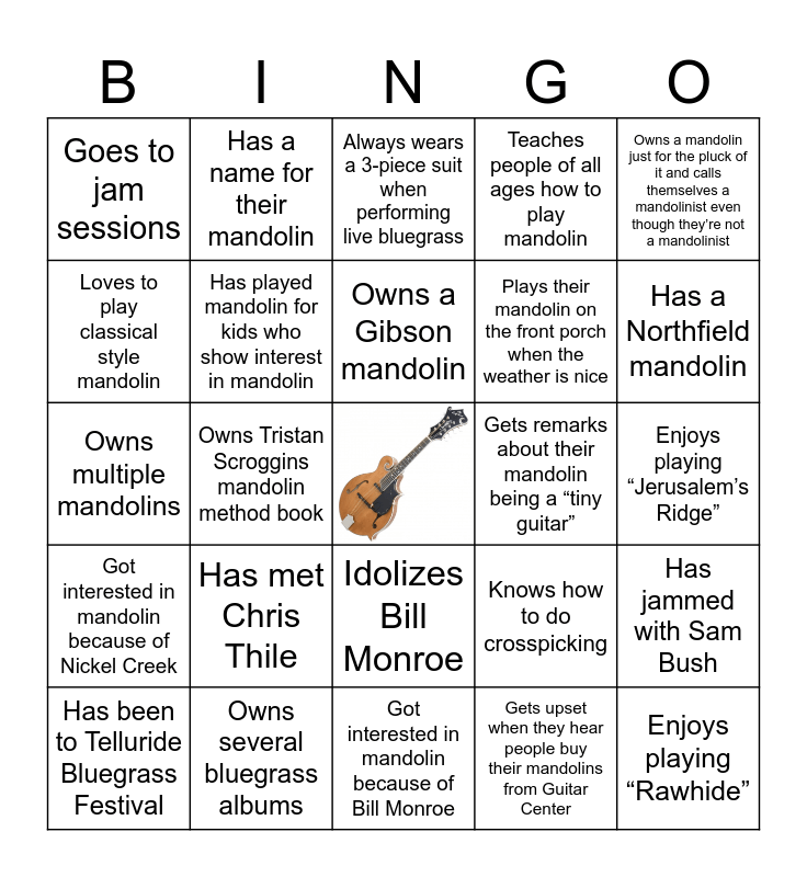 This bingo card has a free space and 24 words: Has met Chris Thile, Owns several bluegrass albums, Owns a Gibson mandolin, Has been to Telluride Bluegrass Festival, Owns a mandolin just for the pluck of it and calls themselves a mandolinist even though they’re not a mandolinist, Goes to jam sessions, Loves to play classical style mandolin, Has a name for their mandolin, Gets remarks about their mandolin being a “tiny guitar”, Idolizes Bill Monroe, Plays their mandolin on the front porch when the weather is nice, Owns multiple mandolins, Knows how to do crosspicking, Has jammed with Sam Bush, Has played mandolin for kids who show interest in mandolin, Gets upset when they hear people buy their mandolins from Guitar Center, Enjoys playing “Jerusalem’s Ridge”, Always wears a 3-piece suit when performing live bluegrass, Has a Northfield mandolin, Owns Tristan Scroggins mandolin method book, Enjoys playing “Rawhide”, Got interested in mandolin because of Nickel Creek, Teaches people of all ages how to play mandolin and Got interested in mandolin because of Bill Monroe.