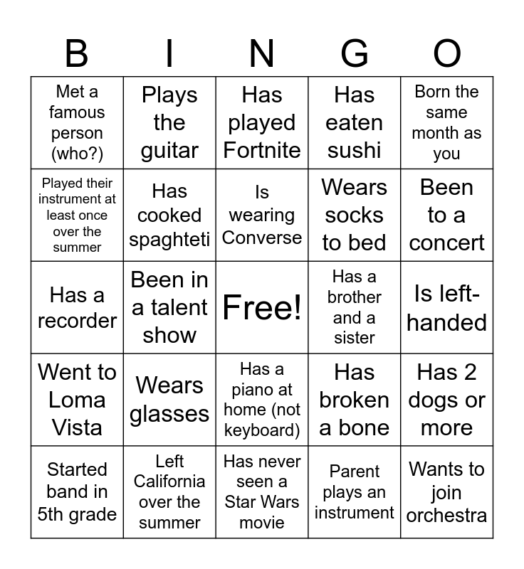 This bingo card has a free space and 24 words: Wears glasses, Left California over the summer, Is wearing Converse, Started band in 5th grade, Born the same month as you, Met a famous person (who?), Played their instrument at least once over the summer, Plays the guitar, Has a brother and a sister, Has a piano at home (not keyboard), Wears socks to bed, Has a recorder, Has broken a bone, Has 2 dogs or more, Has cooked spaghteti, Parent plays an instrument, Is left-handed, Has played Fortnite, Been to a concert, Been in a talent show, Wants to join orchestra, Went to Loma Vista, Has eaten sushi and Has never seen a Star Wars movie.