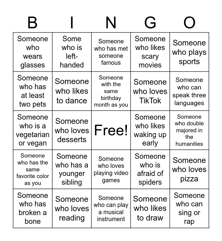 This bingo card has a free space and 24 words: Someone who has a younger sibling, Someone who loves reading, Someone with the same birthday month as you, Someone who has broken a bone, Someone who plays sports, Someone who wears glasses, Someone who has at least two pets, Some who is left-handed, Someone who likes waking up early, Someone who loves playing video games, Someone who loves TikTok, Someone who is a vegetarian or vegan, Someone who is afraid of spiders, Someone who loves pizza, Someone who likes to dance, Someone who likes to draw, Someone who double majored in the humanities, Someone who has met someone famous, Someone who can speak three languages, Someone who loves desserts, Someone who can sing or rap, Someone who has the same favorite color as you, Someone who likes scary movies and Someone who can play a musical instrument.