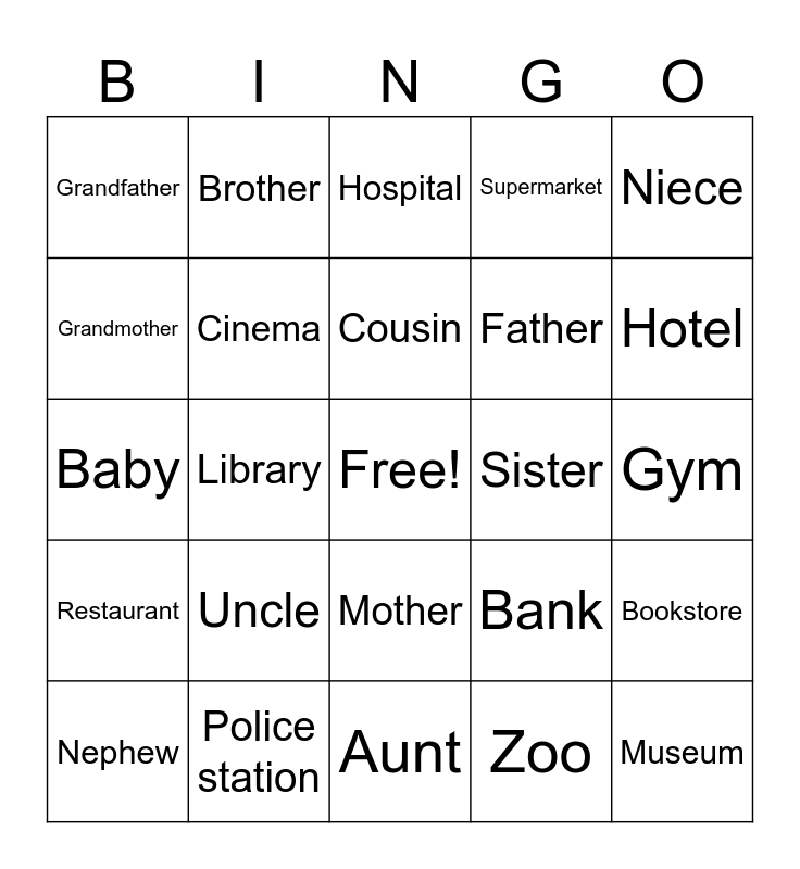 This bingo card has a free space and 25 words: Uncle, Aunt, Cousin, Nephew, Niece, Grandfather, Grandmother, Brother, Sister, Mother, Father, Baby, Bank, Bookstore, Cinema, Bus station, Gym, Hospital, Hotel, Library, Museum, Police station, Restaurant, Supermarket and Zoo.