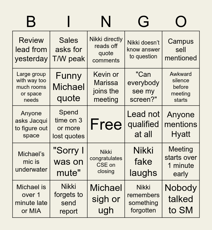 This bingo card has a free space and 27 words: Nikki fake laughs, Elyssa says "Sorry", "Can everybody see my screen?", Michael sigh or ugh, Large group with way too much rooms or space needs, Nikki directly reads off quote comments, Sales asks for T/W peak, Michael’s mic is underwater, Lead not qualified at all, Meeting starts over 1 minute early, Anyone asks Jacqui to figure out space, Nikki doesn’t know answer to question, Michael is over 1 minute late or MIA, Nikki forgets to send report, Awkward silence before meeting starts, Marina pushes large group outside of strategy, Funny Michael quote, Kevin or Marissa joins the meeting, "Sorry I was on mute", Review lead from yesterday, Anyone mentions Hyatt, Nikki remembers something forgotten, Spend time on 3 or more lost quotes, Nobody talked to SM, Nikki congratulates CSE on closing, Campus sell mentioned and Marina asks anyone a personal question.