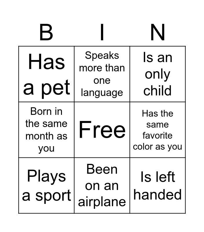 This bingo card has a free space and 8 words: Has the same favorite color as you, Is an only child, Speaks more than one language, Plays a sport, Has a pet, Is left handed, Born in the same month as you and Been on an airplane.
