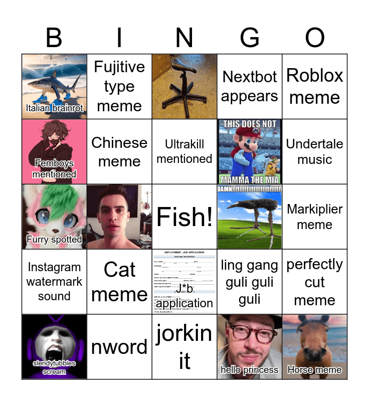 This bingo card has 11 images, a free space and 20 words: Cat meme, nword, Ultrakill mentioned, slendytubbies scream, Roblox meme, Italian brainrot, Femboys mentioned, Fujitive type meme, J*b application, Furry spotted, ling gang guli guli guli, perfectly cut meme, Chinese meme, hello princess, Markiplier meme, Undertale music, Horse meme, Instagram watermark sound, Nextbot appears and jorkin it.