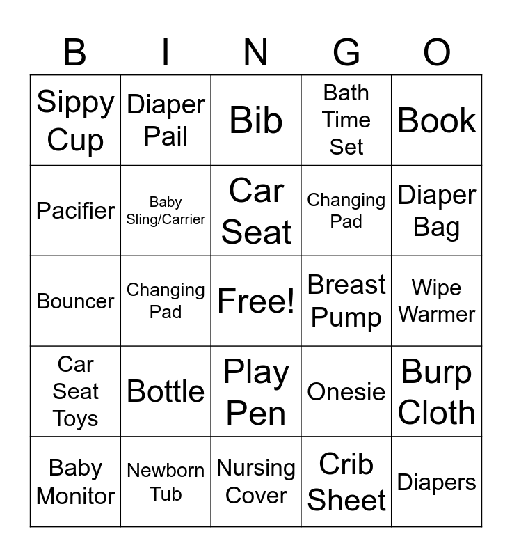 This bingo card has a free space and 30 words: Newborn Tub, Gift Card, Changing Pad, Stuffed Toy, Sippy Cup, Bib, Baby Sling/Carrier, Play Pen, Breast Pump, Nursing Cover, Wipe Warmer, Diapers, Crib Sheet, Photo Album, Diaper Bag, Socks, Onesie, Car Seat Toys, Bottle, Book, Bouncer, Swing, Diaper Pail, Changing Pad, Pacifier, Bath Time Set, Burp Cloth, Baby Monitor, Car Seat and Boppy Pillow.