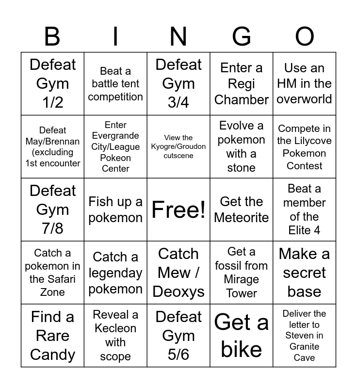 This bingo card has a free space and 24 words: Catch a legenday pokemon, Reveal a Kecleon with scope, View the Kyogre/Groudon cutscene, Find a Rare Candy, Use an HM in the overworld, Defeat Gym 1/2, Defeat May/Brennan (excluding 1st encounter, Beat a battle tent competition, Get the Meteorite, Catch Mew / Deoxys, Evolve a pokemon with a stone, Defeat Gym 7/8, Get a fossil from Mirage Tower, Make a secret base, Enter Evergrande City/League Pokeon Center, Get a bike, Beat a member of the Elite 4, Defeat Gym 3/4, Compete in the Lilycove Pokemon Contest, Fish up a pokemon, Deliver the letter to Steven in Granite Cave, Catch a pokemon in the Safari Zone, Enter a Regi Chamber and Defeat Gym 5/6.