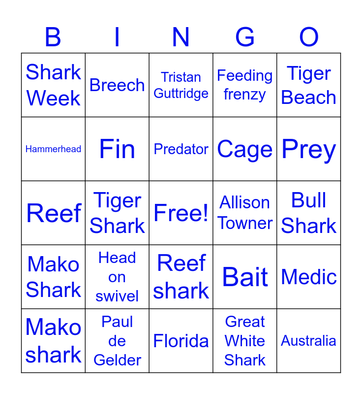 This bingo card has a free space and 24 words: Head on swivel, Paul de Gelder, Predator, Mako shark, Tiger Beach, Shark Week, Hammerhead, Breech, Allison Towner, Reef shark, Cage, Reef, Bait, Medic, Fin, Great White Shark, Bull Shark, Tristan Guttridge, Prey, Tiger Shark, Australia, Mako Shark, Feeding frenzy and Florida.