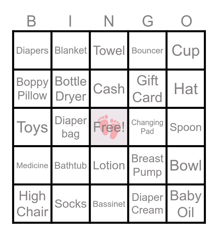 This bingo card has a free space and 46 words: Baby Monitor, Baby Oil, Baby Powder, Bassinet, Bathtub, Bib, Blanket, Book, Boppy Pillow, Bottle, Bottle Dryer, Bouncer, Bowl, Breast Pump, Car Seat, Car Mirror, Cash, Changing Pad, Crib Bedding, Cup, Diaper bag, Diaper Cream, Diapers, Gift Card, Grooming kit, Hat, High Chair, Humidifier, Lotion, Medicine, Onesies, Pacifier, Piggy Bank, Playpen, Shoes, Socks, Spoon, Stroller, Stuffed Animal, Swing, Teethers, Towel, Toys, Walker, Washcloths and Wipes.
