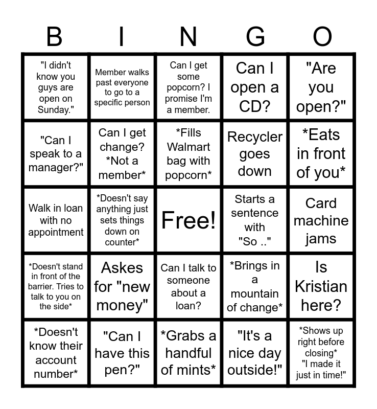 This bingo card has a free space and 29 words: "Do I need to fill out a slip?", "Can I have this pen?", Can I get some popcorn? I promise I'm a member., *Doesn't have slip filled out or no slip*, "Are you open?", "I didn't know you guys are open on Sunday.", Can I get change? *Not a member*, *Fills Walmart bag with popcorn*, Starts a sentence with "So ..", Is Kristian here?, *Doesn't know their account number*, *Doesn't say anything just sets things down on counter*, "It's a nice day outside!", *Shows up right before closing* "I made it just in time!", Walk in loan with no appointment, "Where's the ATM?", *Grabs a handful of mints*, *Brings in a mountain of change*, *Eats in front of you*, *Doesn't stand in front of the barrier. Tries to talk to you on the side*, Askes for "new money", Gives you unwanted political views, Recycler goes down, Card machine jams, "Can I speak to a manager?", Member walks past everyone to go to a specific person, Can I talk to someone about a loan?, Can I open a CD? and What are your rates?.
