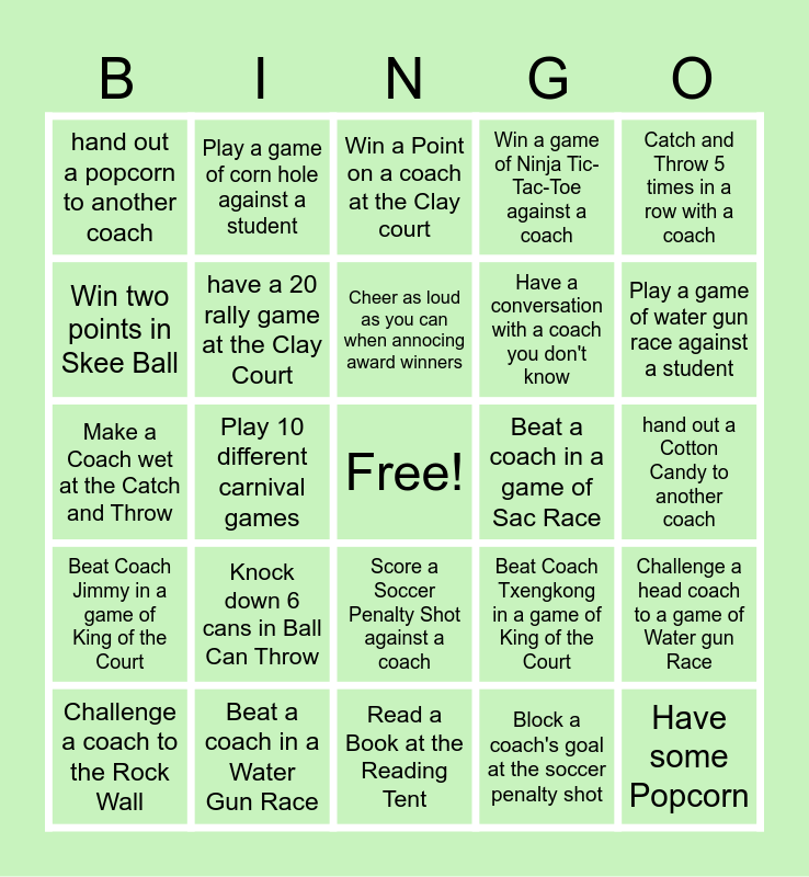 This bingo card has a free space and 44 words: Have a Cotton Candy, Have some Popcorn, Have a Sno-Cone, Challenge a coach to the Rock Wall, Stay as the King of the Court for Two turns, Block a coach's goal at the soccer penalty shot, Win a Point on a coach at the Clay court, Beat a Coach in a game of Corn Hole, Catch and Throw 5 times in a row with a coach, Beat a coach in a Water Gun Race, Win a game of Ninja Tic-Tac-Toe against a coach, Beat a coach in a game of Sac Race, Score a Soccer Penalty Shot against a coach, Knock down 6 cans in Ball Can Throw, Face Paint a Coach, Read a Book at the Reading Tent, Catch and throw 10 times in a row, Make a Coach wet at the Catch and Throw, Play a game of ninja tic tac toe against a student, Play a game of water gun race against a student, Play a game of corn hole against a student, Read a Story to a student at the reading tent, Win a bubble competition against a student, hand out a popcorn to another coach, hand out a Sno-cone to another coach, hand out a Cotton Candy to another coach, Beat Coach Vilai in a game of King of the Court, Beat Coach Chalee in a game of King of the Court, Beat Coach Txengkong in a game of King of the Court, Beat Coach Jimmy in a game of King of the Court, Beat Coach Daniel in a game of King of the Court, Challenge a head coach to a game of Water gun Race, Challenge a head coach to a game of Corn Hole, Play 5 different carnival games, Play 10 different carnival games, have a conversation with a student or donor, Help Clean up before Water gun Fight, Help Marta pass out food or anything she needs, Cheer as loud as you can when annocing award winners, Win two points in Skee Ball, Have a conversation with a coach you don't know, Beat the time of the previous coach at the ball can throw, have a 20 rally game at the Clay Court and Break a coaches ankles (Metaphorically) at the Soccer Penalty shot.