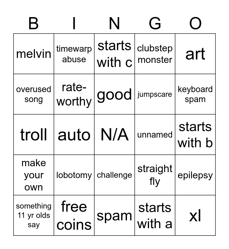 This bingo card has a free space and 24 words: lobotomy, free coins, good, something 11 yr olds say, art, melvin, overused song, timewarp abuse, unnamed, challenge, jumpscare, troll, straight fly, epilepsy, rate-worthy, starts with a, starts with b, starts with c, keyboard spam, auto, xl, make your own, clubstep monster and spam.