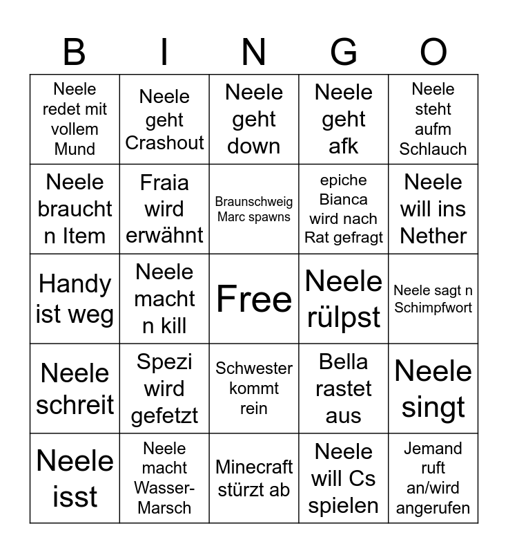 This bingo card has a free space and 24 words: Neele isst, Spezi wird gefetzt, Braunschweig Marc spawns, Neele will Cs spielen, Neele steht aufm Schlauch, Neele redet mit vollem Mund, Neele geht Crashout, Neele geht down, Neele rülpst, Neele sagt n Schimpfwort, Handy ist weg, Fraia wird erwähnt, Bella rastet aus, Neele singt, Neele braucht n Item, Neele macht Wasser-Marsch, Minecraft stürzt ab, Neele geht afk, Neele will ins Nether, Neele schreit, Neele macht n kill, Schwester kommt rein, epiche Bianca wird nach Rat gefragt and Jemand ruft an/wird angerufen.