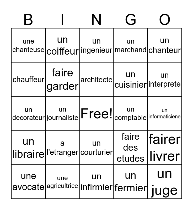 This bingo card has a free space and 24 words: a l'etranger, une agricultrice, architecte, une avocate, un chanteur, une chanteuse, chauffeur, un coiffeur, un comptable, un courturier, un cuisinier, un decorateur, faire des etudes, fairer livrer, faire garder, un fermier, un informaticiene, un ingenieur, un interprete, un journaliste, un juge, un libraire, un marchand and un infirmier.