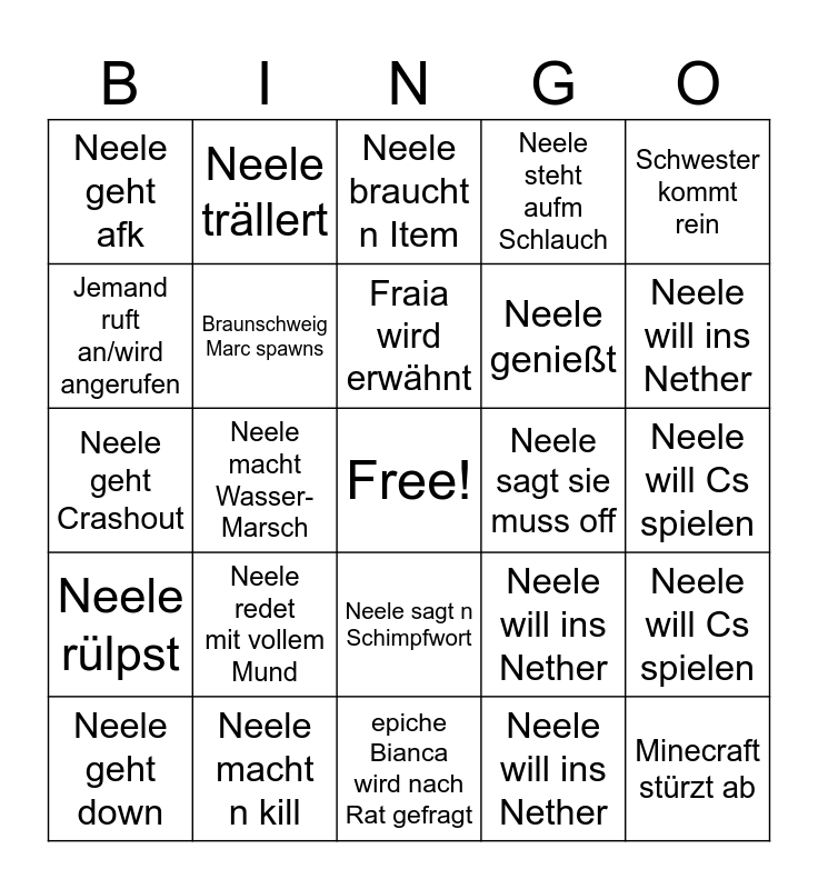 This bingo card has a free space and 24 words: Neele redet mit vollem Mund, Neele macht n kill, Fraia wird erwähnt, Neele geht down, Schwester kommt rein, Neele geht afk, Jemand ruft an/wird angerufen, Neele trällert, Neele sagt sie muss off, Neele sagt n Schimpfwort, Neele genießt, Neele geht Crashout, Neele will ins Nether, Neele will Cs spielen, Braunschweig Marc spawns, Neele will ins Nether, Neele will Cs spielen, Neele braucht n Item, Neele will ins Nether, Neele macht Wasser- Marsch, Minecraft stürzt ab, Neele rülpst, Neele steht aufm Schlauch and epiche Bianca wird nach Rat gefragt.