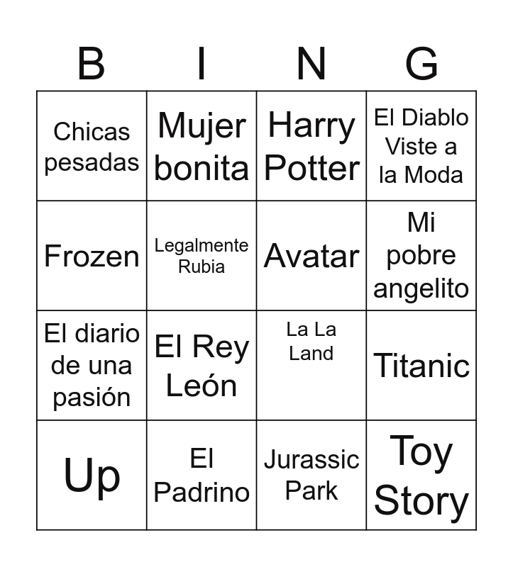 This bingo card has 24 words: Coco, Bohemian Rhapsody, Mi pobre angelito, Mamma Mia!, Frozen, Chicas pesadas, Legalmente Rubia, Mujer bonita, El Padrino, Volver al Futuro, El diario de una pasión, La La Land, Buscando a Nemo, Shrek, Avatar, Forrest Gump, Jurassic Park, Harry Potter, El Rey León, Titanic, Up, Toy Story, El Diablo Viste a la Moda and Rápidos y Furiosos.