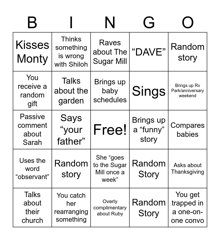 This bingo card has a free space and 24 words: Random story, You catch her rearranging something, Brings up baby schedules, Talks about their church, Random story, Kisses Monty, You receive a random gift, Thinks something is wrong with Shiloh, Brings up a “funny” story, She “goes to the Sugar Mill once a week”, Sings, Passive comment about Sarah, Random Story, Asks about Thanksgiving, Talks about the garden, Random Story, Compares babies, Raves about The Sugar Mill, Brings up Rv Park/anniversary weekend, Says “your father”, You get trapped in a one-on-one convo, Uses the word “observant”, “DAVE” and Overly complimentary about Ruby.