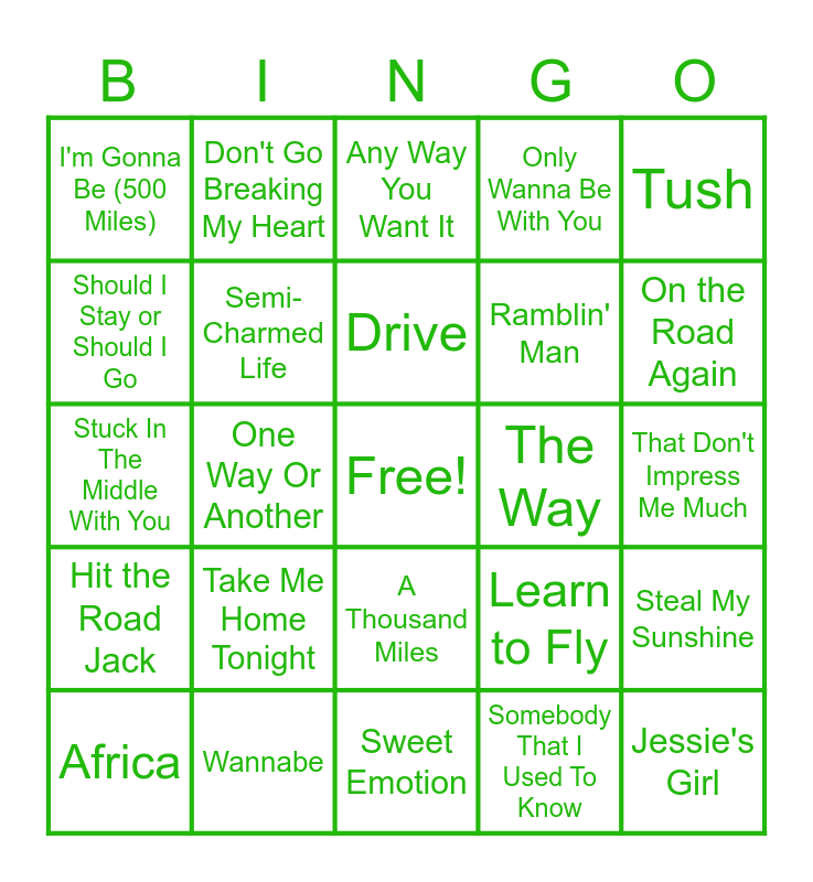 This bingo card has a free space and 47 words: Go Your Own Way, Jessie's Girl, Take It Easy, Sweet Emotion, Take Me Home Tonight, Life in the Fast Lane, Don't Go Breaking My Heart, Start Me Up, Should I Stay or Should I Go, Low Rider, Semi-Charmed Life, Only Wanna Be With You, Steal My Sunshine, Learn to Fly, One Headlight, Every Morning, Drive, The Way, Fast Car, Tush, One Way Or Another, Somebody That I Used To Know, I'm Gonna Be (500 Miles), Ramblin' Man, Here I Go Again, On the Road Again, Africa, Home, A Thousand Miles, Hit the Road Jack, Don't Stop Me Now, I Believe in a Thing Called Love, Tiny Dancer, Take Me Home, Country Roads, Carry on Wayward Son, Wannabe, That Don't Impress Me Much, Little Red Corveette, Proud Mary, Brown Eyed Girl, Free Fallin', Any Way You Want It, Stuck In The Middle With You, 9 to 5, Edge of Seventeen, Sweet Caroline and You're The One That I Want.