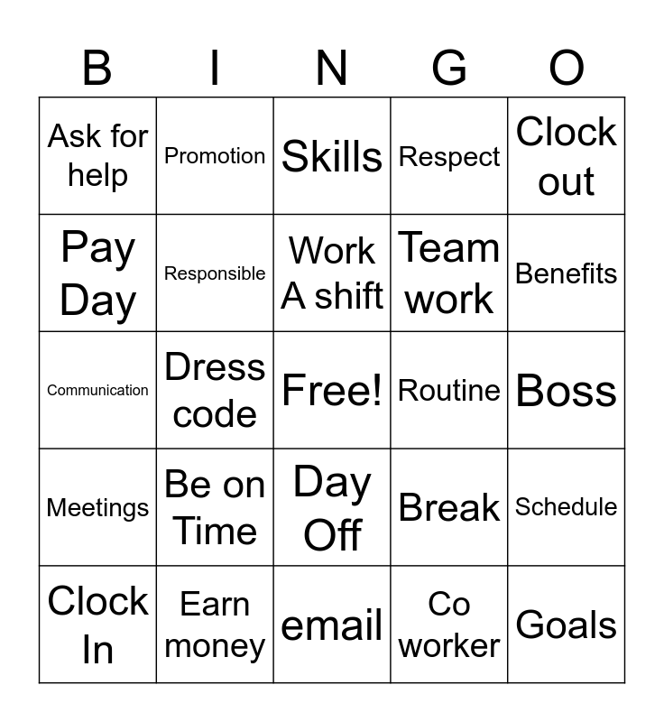 This bingo card has a free space and 24 words: Be on Time, Earn money, Work A shift, Clock In, Clock out, Ask for help, Pay Day, Promotion, Routine, Day Off, Team work, Communication, Break, Schedule, Responsible, Co worker, Boss, Skills, Benefits, Dress code, Goals, Meetings, Respect and email.