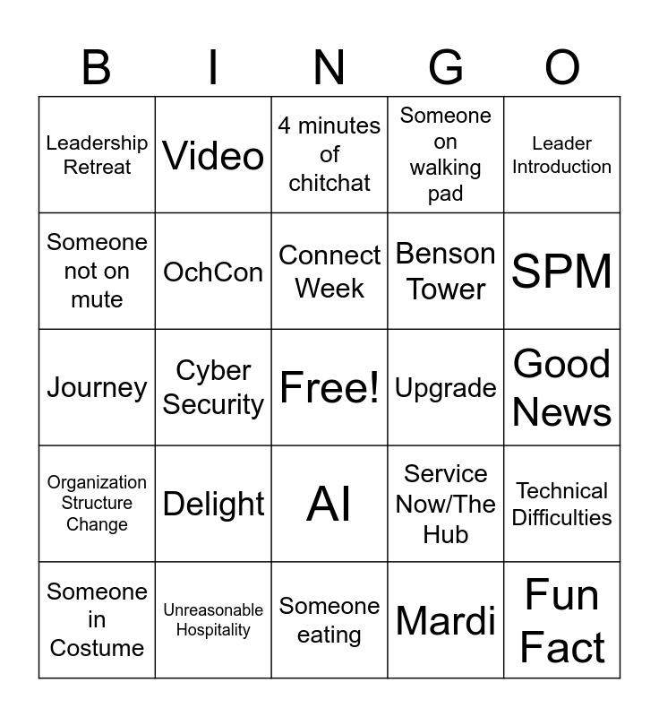 This bingo card has a free space and 24 words: Delight, Unreasonable Hospitality, Connect Week, Someone in Costume, Leader Introduction, Leadership Retreat, Someone not on mute, Video, Upgrade, AI, Benson Tower, Journey, Service Now/The Hub, Technical Difficulties, OchCon, Mardi, Good News, 4 minutes of chitchat, SPM, Cyber Security, Fun Fact, Organization Structure Change, Someone on walking pad and Someone eating.