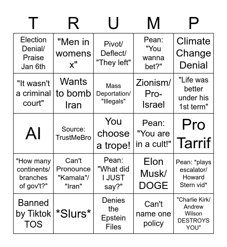 This bingo card has a free space and 24 words: Can't Pronounce "Kamala"/ "Iran", *Slurs*, Mass Deportation/ "Illegals", Banned by Tiktok TOS, Climate Change Denial, Election Denial/ Praise Jan 6th, "It wasn't a criminal court", "Men in womens x", Pean: "You are in a cult!", Pean: "What did I JUST say?", Zionism/ Pro-Israel, AI, Elon Musk/ DOGE, Pean: *plays escalator/ Howard Stern vid*, Wants to bomb Iran, Can't name one policy, Pro Tarrif, Pivot/ Deflect/ "They left", "Life was better under his 1st term", Source: TrustMeBro, "Charlie Kirk/ Andrew Wilson DESTROYS YOU", "How many continents/ branches of gov't?", Pean: "You wanna bet?" and Denies the Epstein Files.