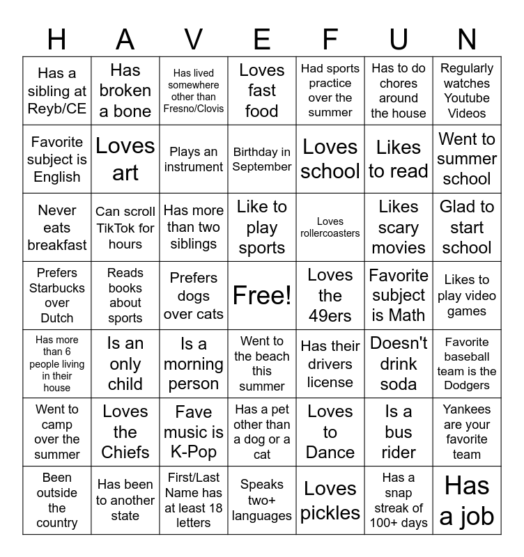 This bingo card has a free space and 48 words: Loves to Dance, Likes to read, Speaks two+ languages, Reads books about sports, Has more than two siblings, Likes to play video games, Has broken a bone, Has been to another state, Has to do chores around the house, Went to the beach this summer, Regularly watches Youtube Videos, Loves fast food, Likes scary movies, Loves rollercoasters, Went to camp over the summer, Favorite subject is Math, Favorite subject is English, Went to summer school, Is a bus rider, Had sports practice over the summer, Loves school, Prefers dogs over cats, Has a sibling at Reyb/CE, Loves art, Yankees are your favorite team, Plays an instrument, Glad to start school, Been outside the country, Like to play sports, Can scroll TikTok for hours, Has a snap streak of 100+ days, Loves the 49ers, Favorite baseball team is the Dodgers, Loves the Chiefs, Prefers Starbucks over Dutch, Has their drivers license, Doesn't drink soda, Never eats breakfast, Is a morning person, Fave music is K-Pop, Has more than 6 people living in their house, Has a job, Has lived somewhere other than Fresno/Clovis, First/Last Name has at least 18 letters, Birthday in September, Has a pet other than a dog or a cat, Is an only child and Loves pickles.