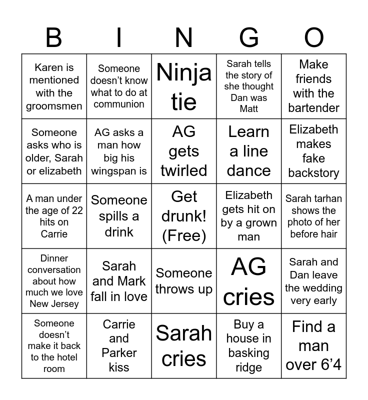 This bingo card has a free space and 24 words: Sarah and Mark fall in love, Carrie and Parker kiss, AG gets twirled, Someone doesn’t make it back to the hotel room, Make friends with the bartender, Karen is mentioned with the groomsmen, Someone asks who is older, Sarah or elizabeth, Someone doesn’t know what to do at communion, Elizabeth gets hit on by a grown man, Someone throws up, Learn a line dance, A man under the age of 22 hits on Carrie, AG cries, Sarah and Dan leave the wedding very early, AG asks a man how big his wingspan is, Buy a house in basking ridge, Sarah tarhan shows the photo of her before hair, Ninja tie, Elizabeth makes fake backstory, Someone spills a drink, Find a man over 6’4, Dinner conversation about how much we love New Jersey, Sarah tells the story of she thought Dan was Matt and Sarah cries.