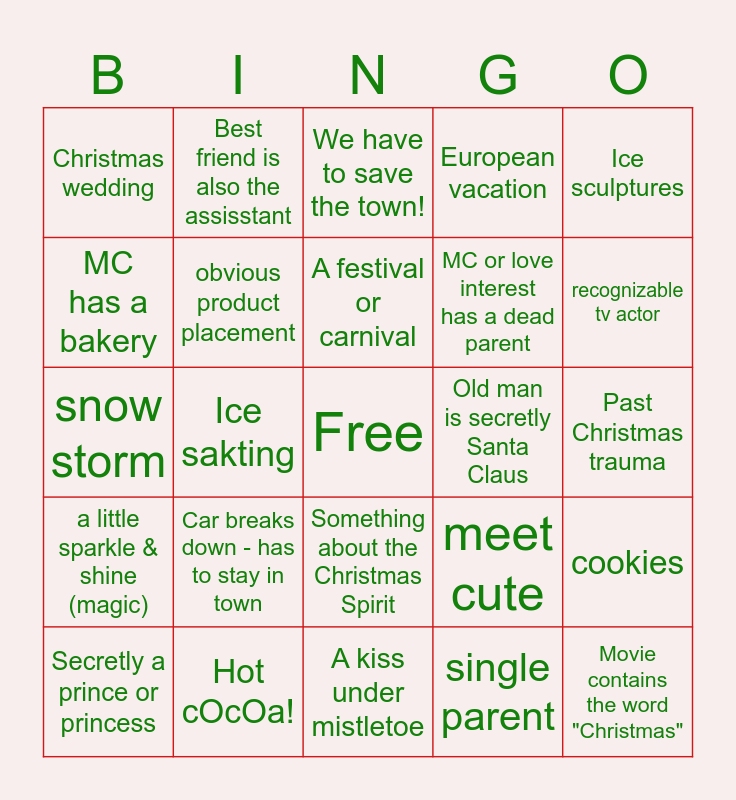 This bingo card has a free space and 24 words: Car breaks down - has to stay in town, Hot cOcOa!, A festival or carnival, Secretly a prince or princess, Ice sculptures, Christmas wedding, MC has a bakery, Best friend is also the assisstant, Old man is secretly Santa Claus, Something about the Christmas Spirit, MC or love interest has a dead parent, snow storm, meet cute, cookies, obvious product placement, single parent, Past Christmas trauma, We have to save the town!, recognizable tv actor, Ice sakting, Movie contains the word "Christmas", a little sparkle & shine (magic), European vacation and A kiss under mistletoe.